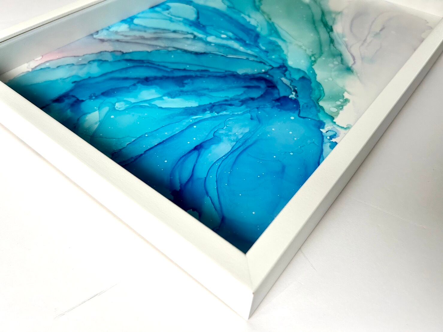 アルコールインクが混ざりながら、偶然が織りなす美しいインクの流れを、アートにしました。
